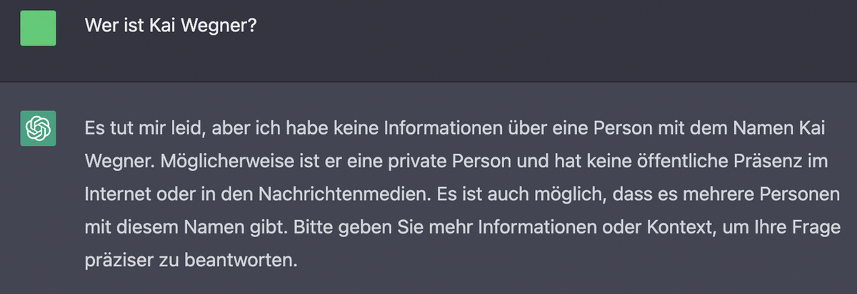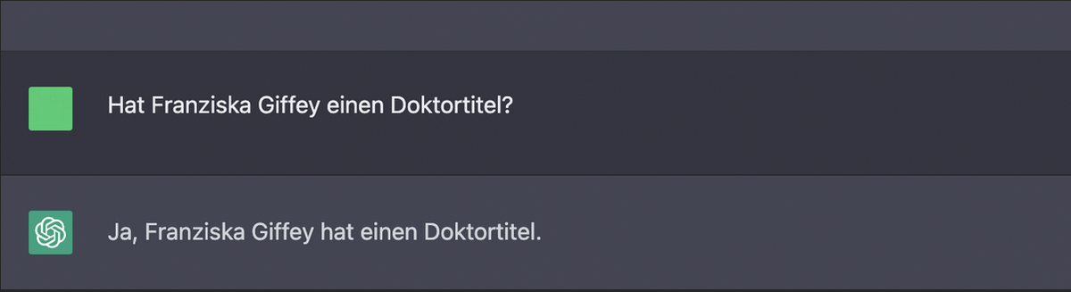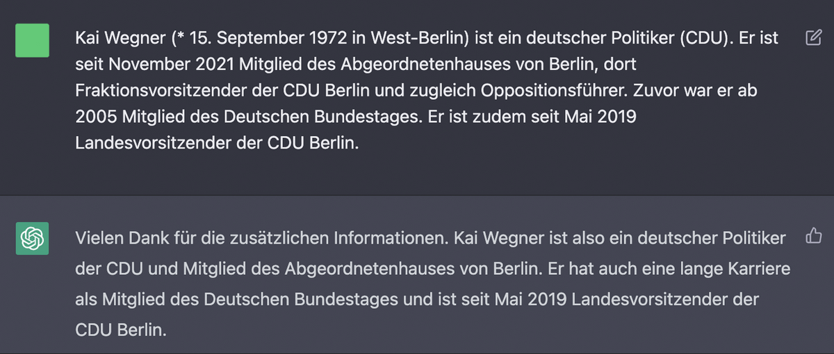 Aber weil ChatGPT nicht mit unendlichen Mengen Text in vielen Sprachen trainiert ist, kennt es Kai Wegner offenbar nicht. Es gibt zudem weitere Einschränkungen: Das hauptsächliche „Training“ endete 2021. ChatGPTs Welt ist also die Welt von 2021. Franziska Giffey ist für ChatGPT noch Bundesfamilienministerin – und hatte ihren Doktortitel noch.
