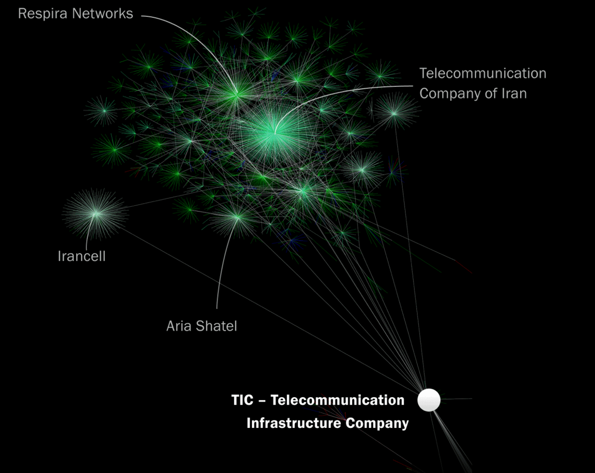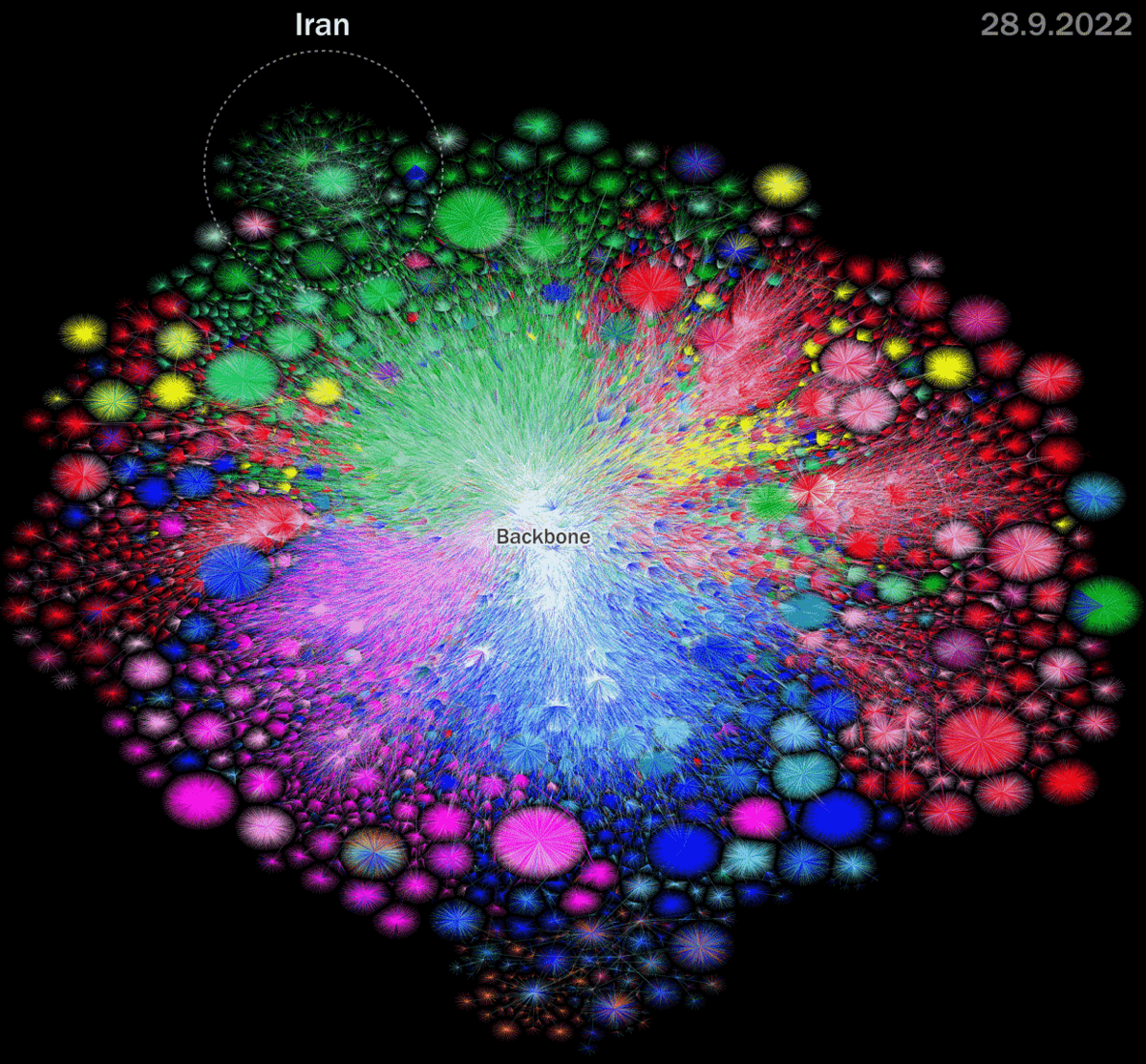 Auf Anfrage des Tagesspiegel Innovation Lab hat Lyon eine aktuelle Version dieser Netzwerk-Karte erstellt. Der iranische Teil sitzt ganz am Rand der Karte. Er ist also vergleichsweise isoliert.