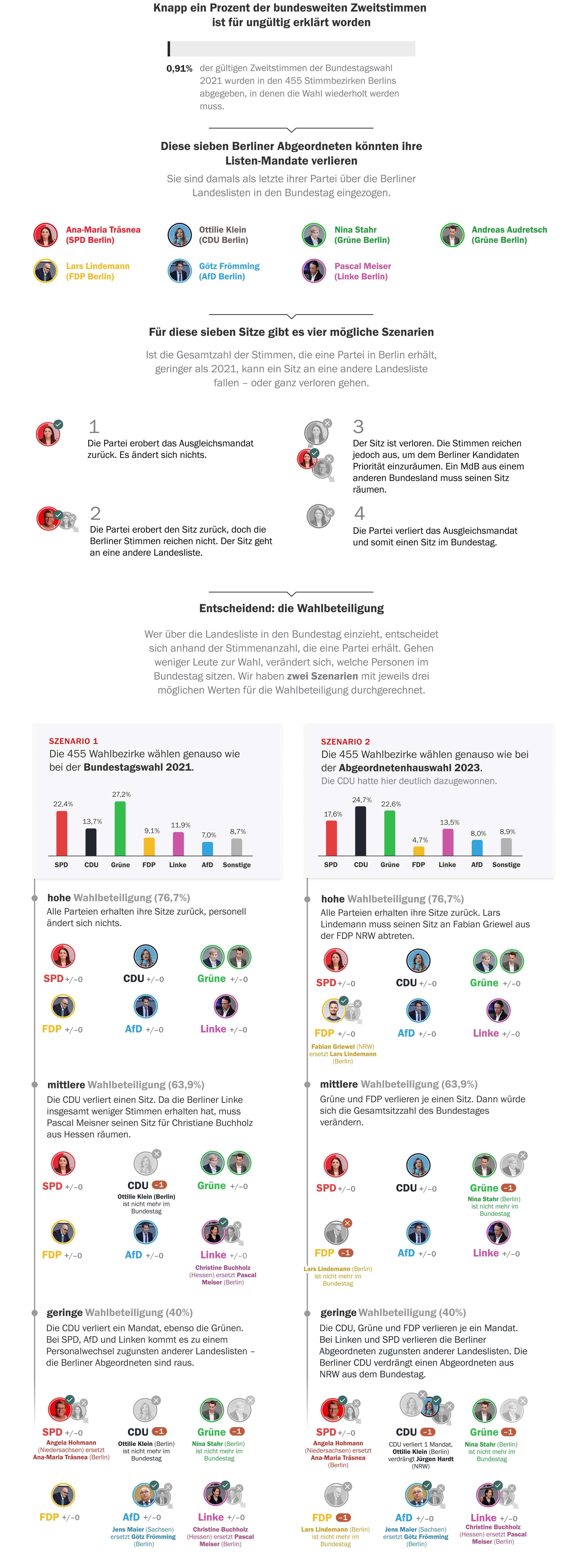 Das Tagesspiegel Innovation Lab hat basierend auf einer Analyse von Wahlrecht.de Szenarien berechnet, wie sich die Wiederholungswahl auf den Bundestag auswirken kann, in dem derzeit 736 Abgeordnete sitzen. Bei den Erststimmen, also den Direktmandaten, sind zwar Veränderungen möglich.